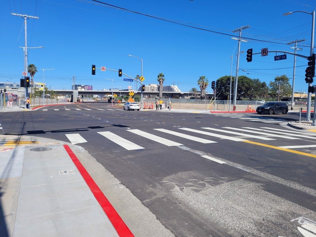 The newly connected 98th Street is now a single contiguous roadway, running from the on- and off-ramps at La Cienega Boulevard to Sepulveda Boulevard.