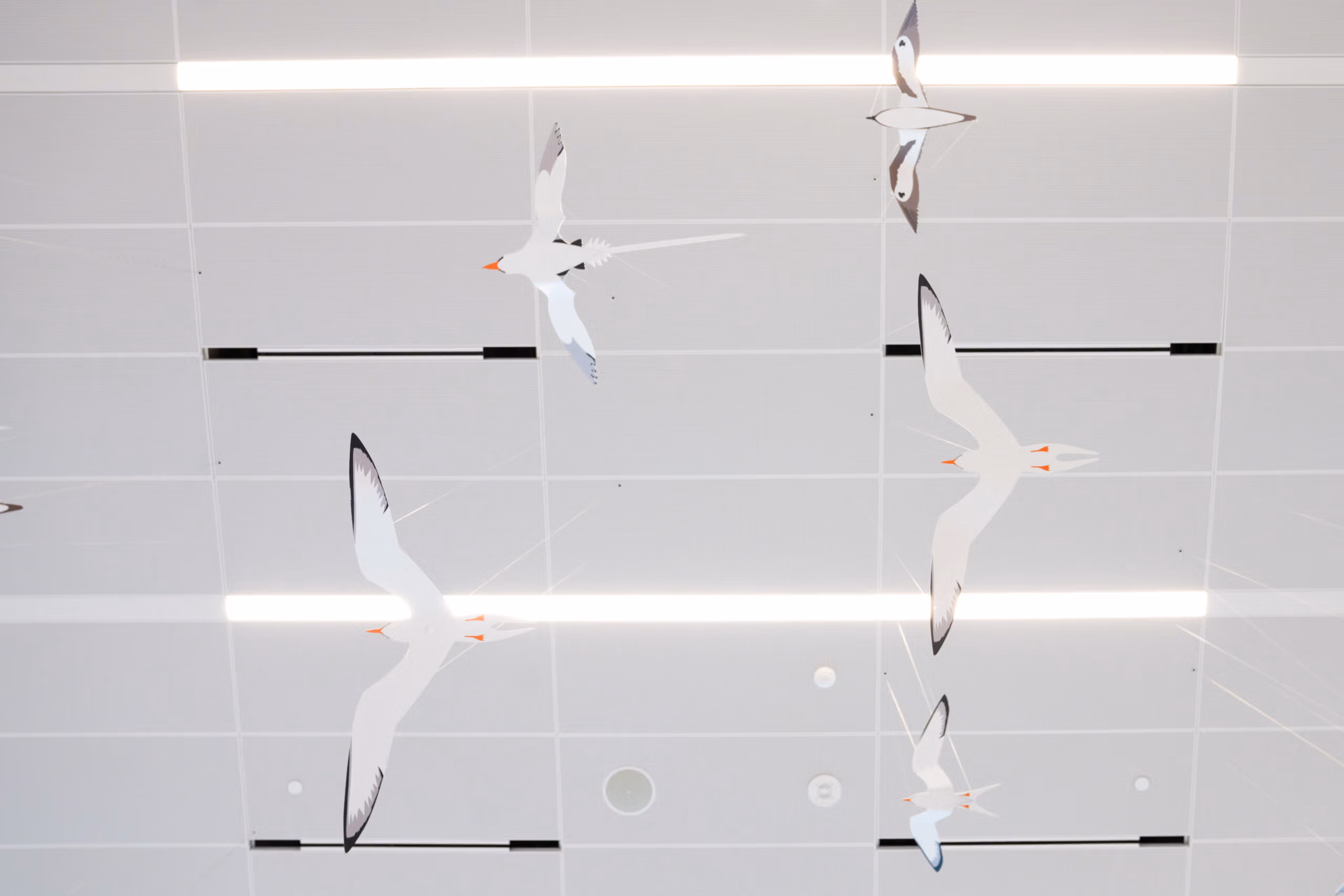 In this regards, Adderley notes that little bits of ‘Bermudiana’ have been incorporated into the interior design of the terminal and can be seen most clearly by the models of cahow and long-tailed birds hanging from the ceiling in the Departures Hall and colourful wayfinding Bermuda kites throughout the building.