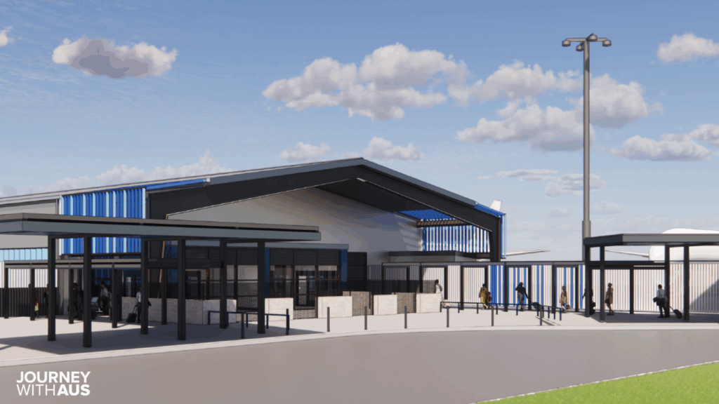 The facility will feature restrooms, a pet relief room, and outdoor canopies to provide shade for passengers using walk-out gates and shuttle buses.