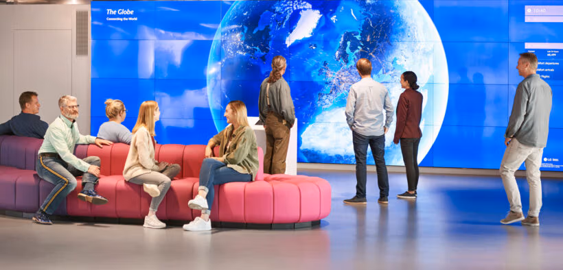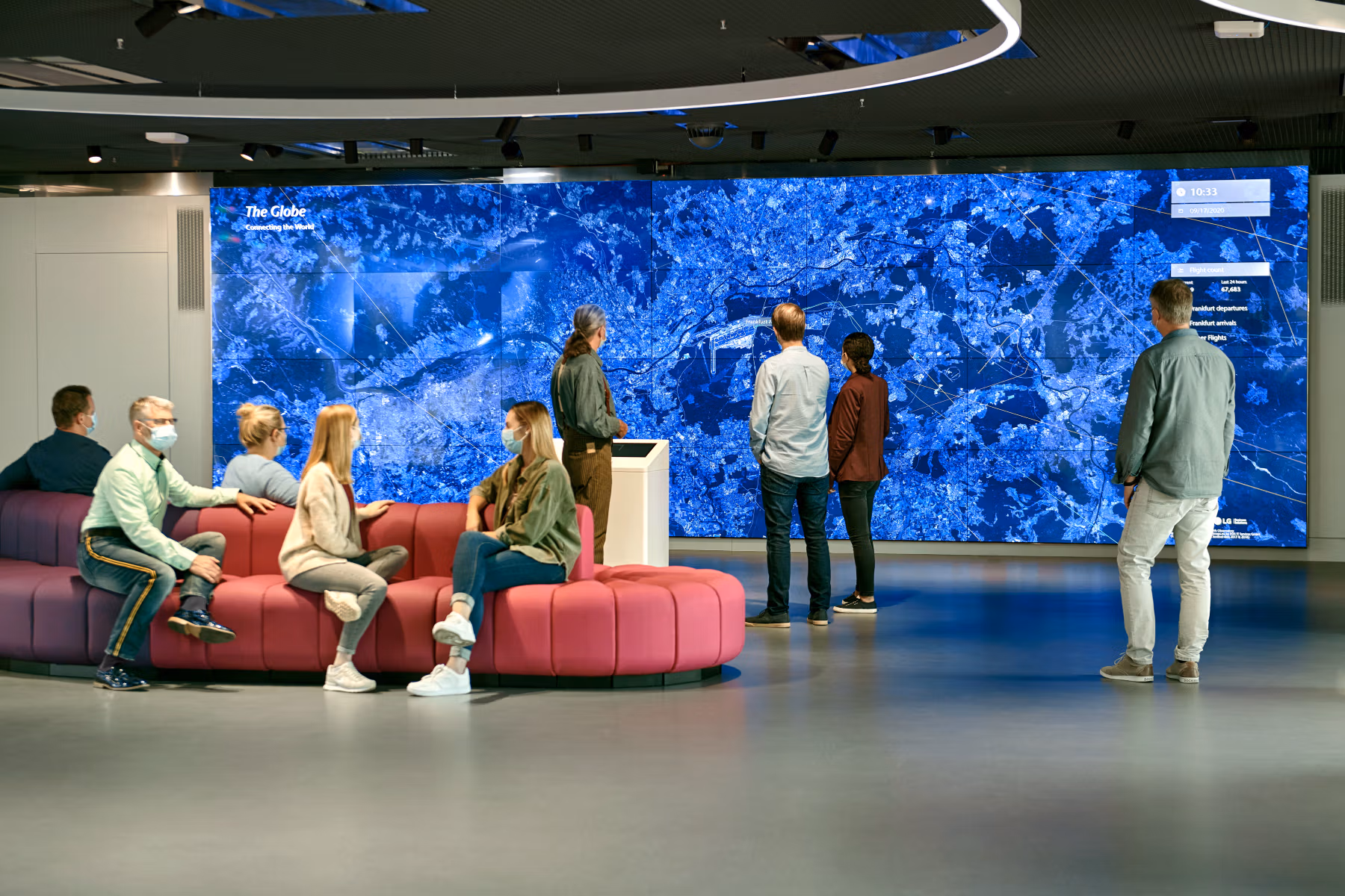 ‘The Globe’ is said to be the most technologically sophisticated exhibit, its interactive LCD wall designed to visualise all active flights around the world in real time. It is made up of 28 individual displays, combined to create a single screen spanning some 25 square metres.