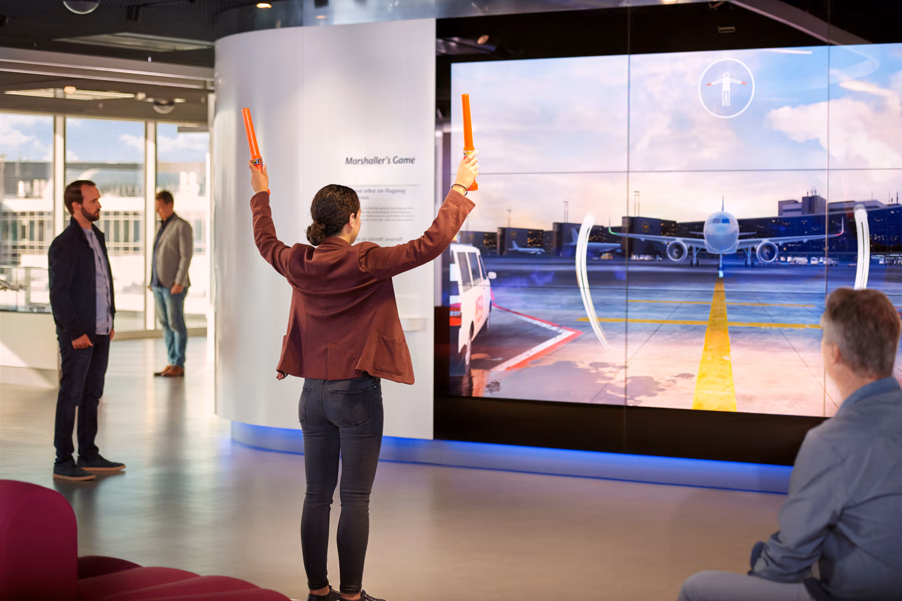 The exhibits invite guests to interact and immerse themselves. In one game, visitors put their marshalling skills to the test by guiding an Airbus A320neo to its parking position. A further highlight is a virtual-reality ride through the airport’s baggage handling system.