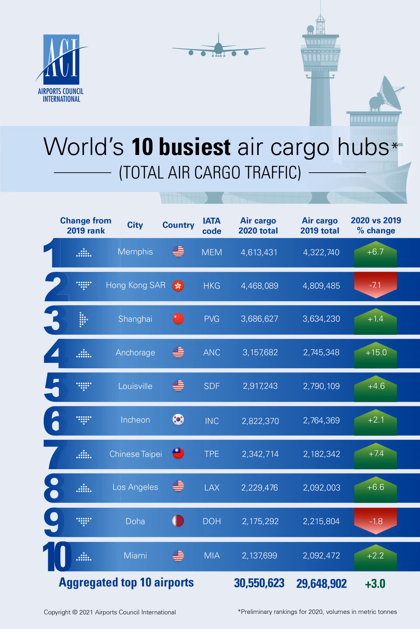 Air cargo volumes in the top 10 airports grew by +3% in 2020. These airports represent around 28% (30.6 million tonnes) of the global volumes in 2020.