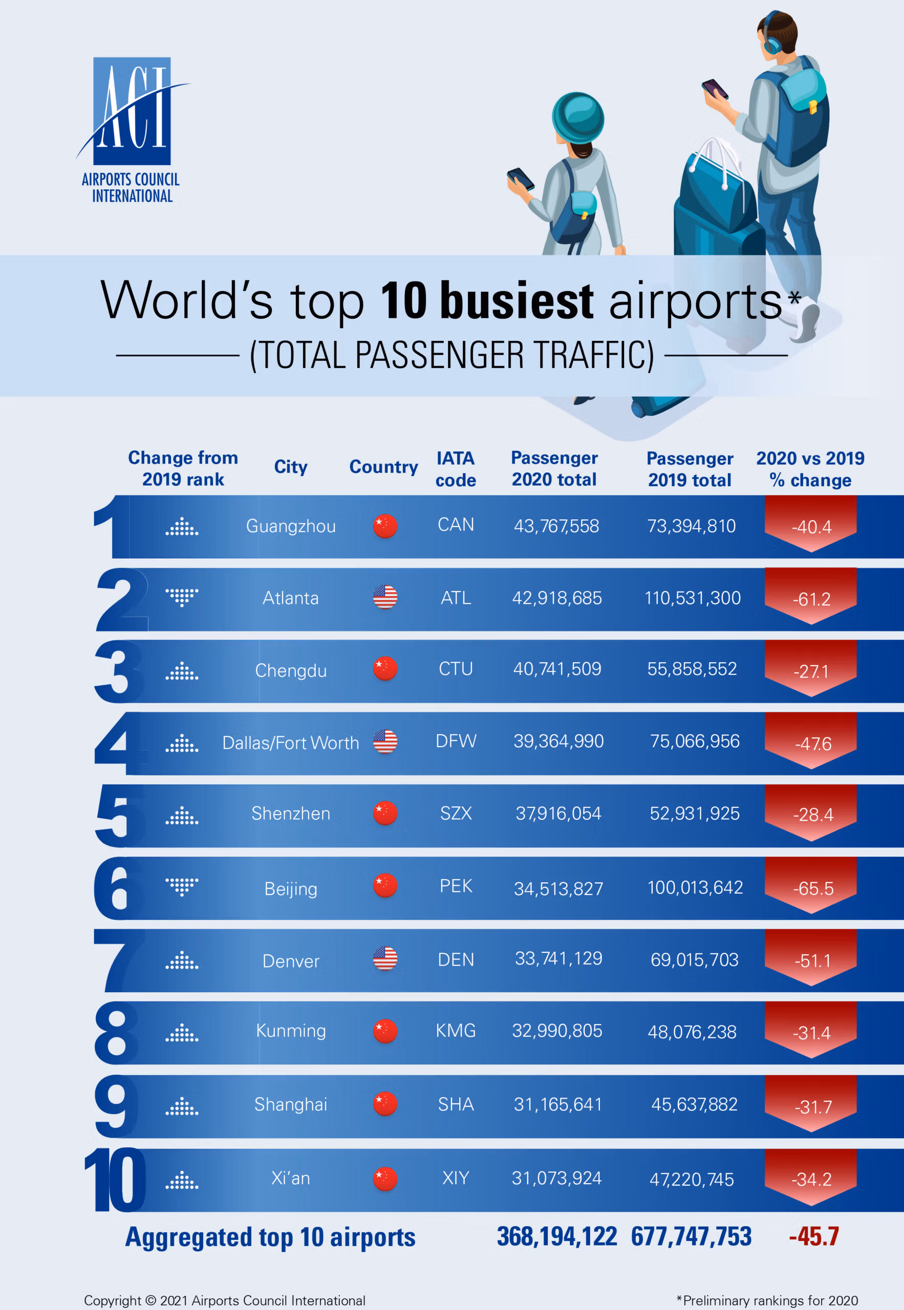 ACI World’s preliminary world airport traffic rankings show that global passenger traffic at the world’s top 10 busiest airports decreased by -45.7% in 2020.