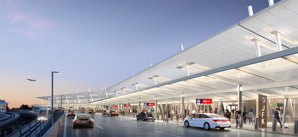 Departure level vestibules include translucent canopies, which illuminate at night like lanterns. The linear check-in hall will include one of the longest departures kerbs at JFK and expanded roadways linking two JFK AirTrain Stations.