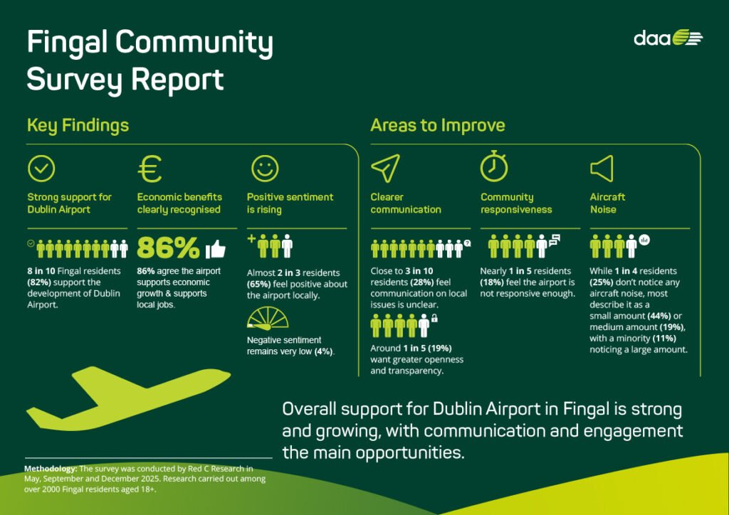 The Fingal Community Survey Report, titled Views and Perspectives of Fingal Communities Regarding the Operations and Development of Dublin Airport – February 2026, was conducted by RED C Research throughout 2025 and shows strong and growing support for Dublin Airport’s role in the local economy, its place in the community and its future development.