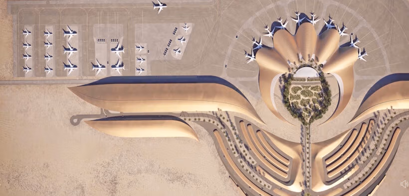 Foster + Partners has come up with a semi-circular terminal divided into five canopied sections reminiscent of undulating sand dunes. Planes can park directly under each cantilevered canopy creating a ‘wow factor’ for viewers inside the terminal.