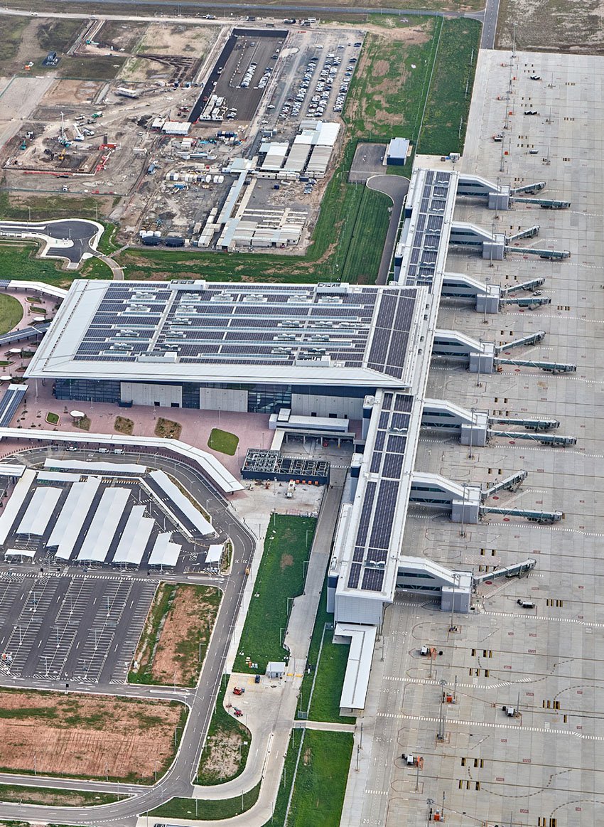 The terminal has a climate-responsive facade, and more than 6,000 solar panels affixed to its roof to provide energy efficiency and renewable electricity, reducing the airport’s carbon footprint.