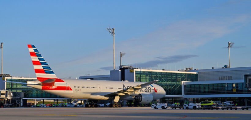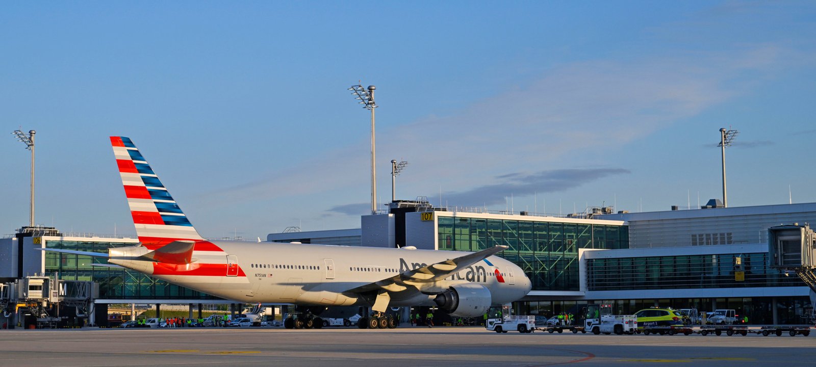 The first arrival of an American Airlines flight from Charlotte at the new pier was greeted with a water salute in Munich.