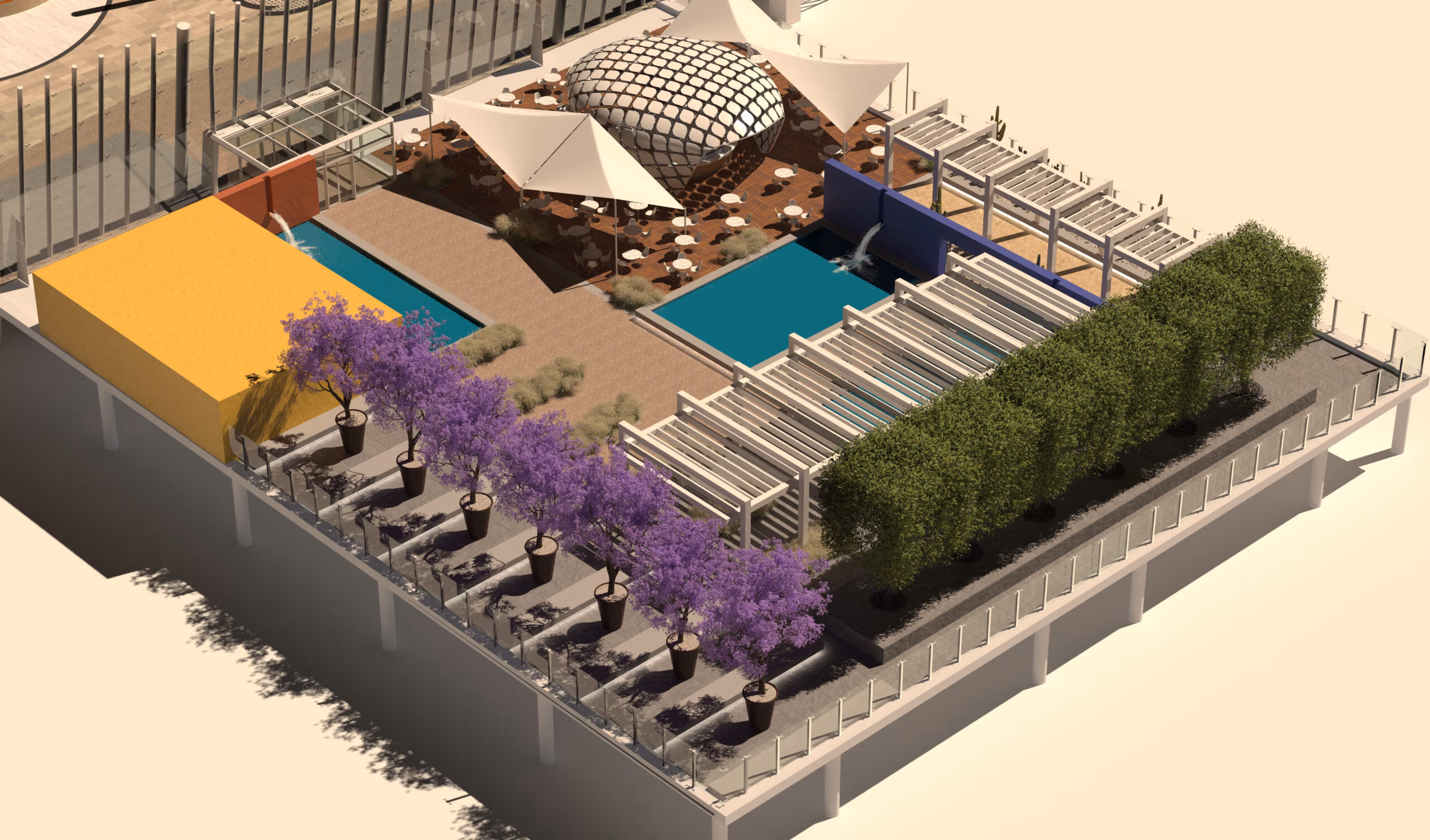 A key area of the redesign is centred on a flat roof canopy, located outside the centre of the terminal building, over an expanded baggage area. The proposal is to transform this into a signature feature of the terminal, with an external garden terrace, surrounding an Agave-inspired architectural shade pod, offering casual seating, planting and a unique eating and drinking destination.