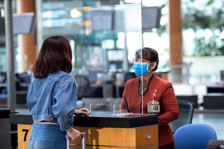 It notes that for those who need to check in at counters staffed by customer service agents, acrylic screens will provide a safe barrier between passengers and staff.