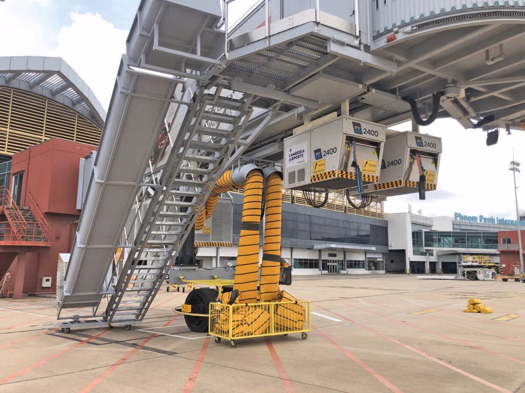 At Phnom Penh International Airport in May 2021, for instance, we installed Fixed Electrical Ground Power (FEGP) and Pre-Conditioned Air (PCA) units at aircraft parking bays, effectively making noisy, CO2 polluting Auxiliary Power Units (APU) redundant.